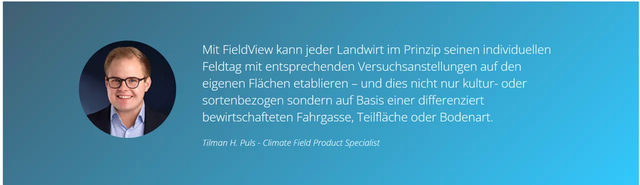 Soviel zum gesellschaftlichen landwirtschaftlichen Umfeld in der Theorie. Über die Situation der Landwirtschaft wird also viel diskutiert, aber wie ist es eigentlich um die Lage auf dem einzelnen Betrieb bestellt? Dazu hat sich Bayer Gedanken gemacht und mit FieldView™ von The Climate Corporation, einer Tochtergesellschaft, die führend bei digitalen Innovationen für die Landwirtschaft ist, eine neue digitale Plattform entwickelt. Diese ist in der Lage, Schlagdaten auswertbar zu machen um aussagekräftige Erkenntnisse zu erhalten, sodass jeder einzelne Landwirt das Ertragspotenzial seiner Flächen nachhaltig steigern, effizienter arbeiten und sein Produktionsrisiko minimieren kann.