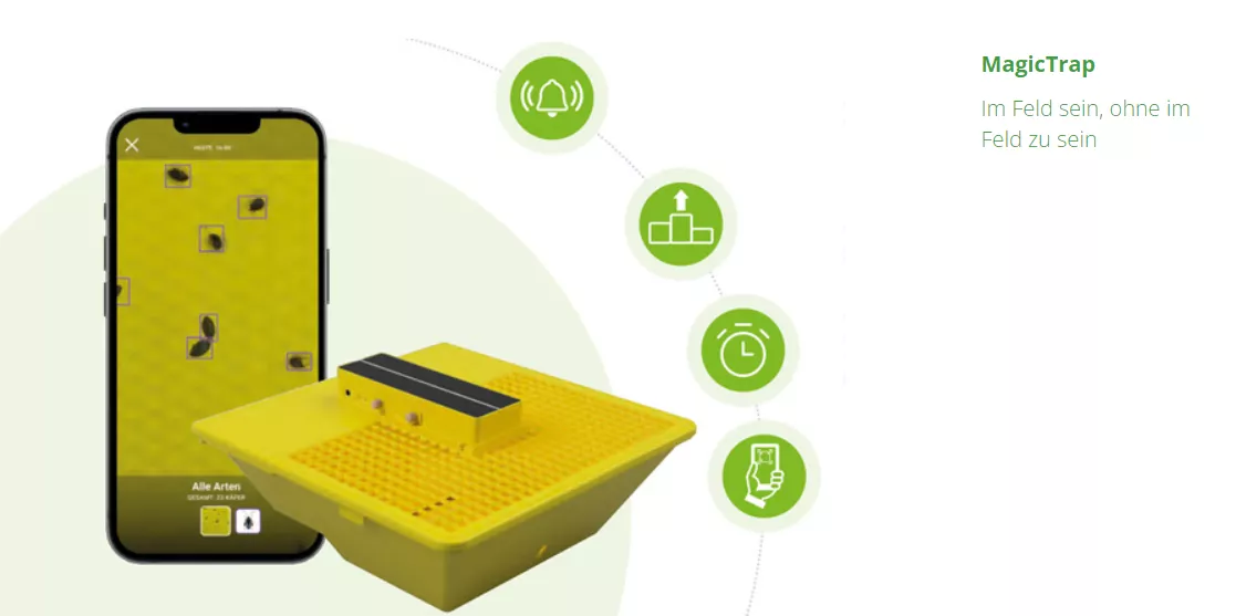Das Herzstück der digitalen Gelbschale ist ein Kameramodul, das an dem Gitter befestigt ist. Dieses verfügt über eine hochauflösende Kamera, eine Mobilfunkeinheit und einen Akku, der mittels eines Solarpanels geladen wird und auch bei schlechtem Wetter die MagicTrap verlässlich mit Strom versorgt.
