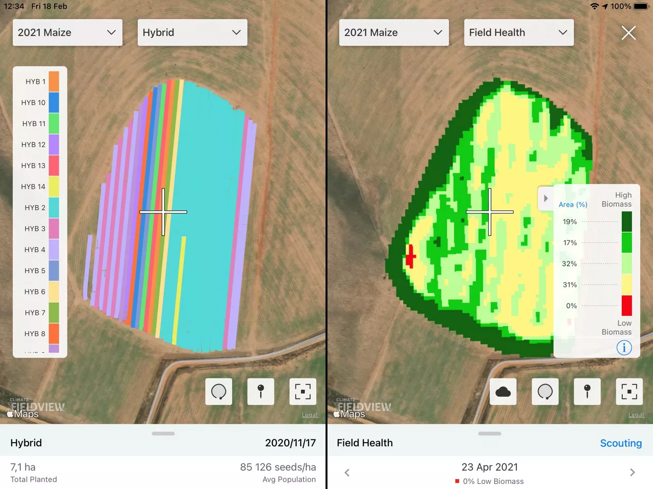 FieldView™ offers the grower the opportunity to seed four years of historic data and satellite imagery that makes it ideal to compare fields from the current season with historic seasons. The grower can use the split-screen functionality to view the fields in parallel comparison.
