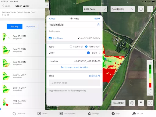 A terepi egészségügyi képek használatakor a gombostű leszúrása és mentése kritikus fontosságú. Ez lehetővé teszi, hogy egy adott, figyelmet igénylő helyet megtaláljon és elmentsen, így az egész szezonban könnyedén folytathatja az adott terület felderítését.