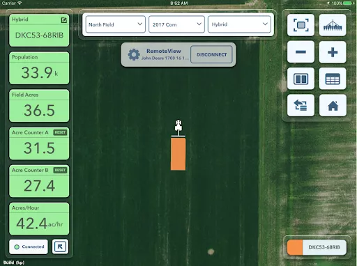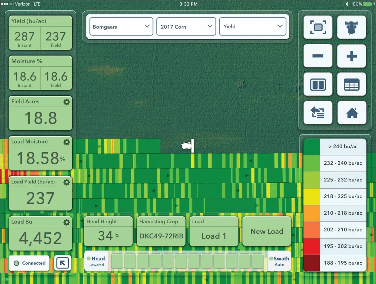 Dzięki aplikacji FieldView™ Cab mapy tworzone w czasie rzeczywistym można obserwować w miarę przejazdu po polu. Dzięki tej wizualizacji można śledzić ilość wysiewanych nasion podczas siewu oraz wysokość zbiorów podczas żniw, a także dostrzegać takie potencjalne problemy, jak nadmierna siła dociskająca podczas wysiewu, zablokowana dysza podczas opryskiwania lub duża wilgotność w trakcie zbiorów, w celu ochrony upraw i zyskania jak najwyższej wydajności. Jeśli wcześniej postępowano zgodnie z instrukcjami opisanymi dla zbiorów, wysiewu oraz opryskiwania, możliwe będzie obserwowanie postępu dla każdego z przejazdów w aplikacji FieldView™ Cab.