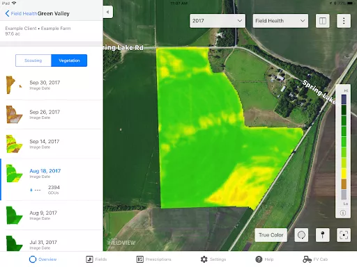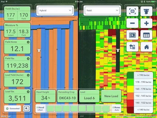 Możesz również wizualizować wiele poziomów danych w aplikacji FIeldView™ Cab w czasie rzeczywistym, w miarę przejazdów po polach. Otwórz aplikację FIeldView™ Cab na urządzeniu iPad®: