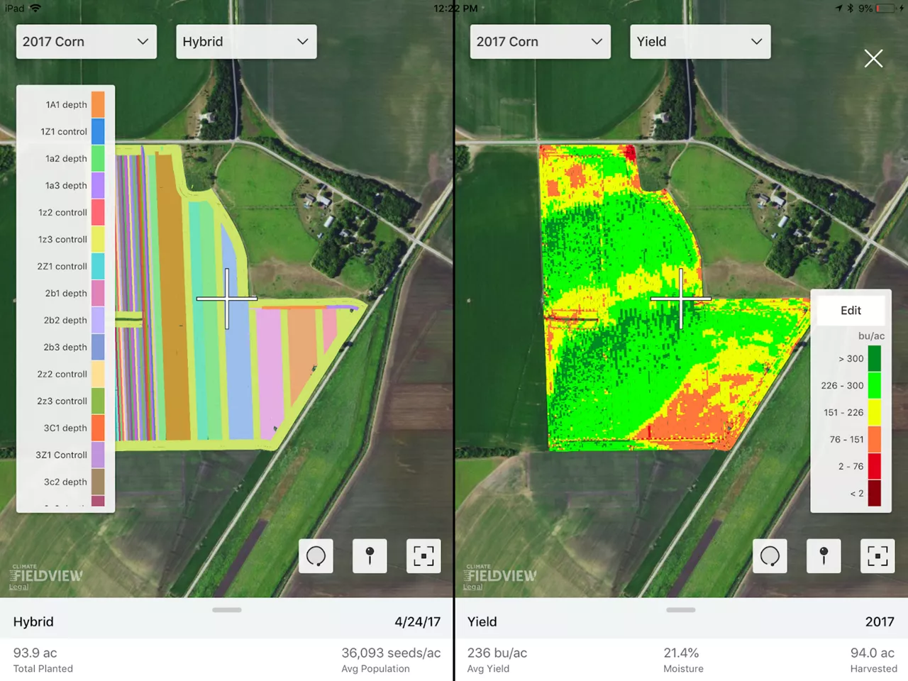 - Z poziomu menu rozwijanego porównaj i przeanalizuj warstwy mapy, na przykład porównanie hybryd i plonu.