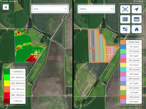 - Korzystając z menu rozwijanych, porównaj i przeanalizuj warstwy mapy, takie jak hybrydy i plon.