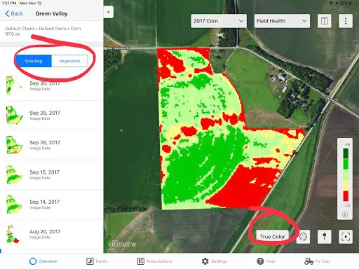 Obrazy w rzeczywistych kolorach zapewniają możliwość sprawdzenia rzeczywistego widoku pola, co jest pomocne podczas porównywania obrazów rozpoznawczych i wegetacyjnych, jak również wykrywania takich przeszkód, jak chmury i cienie.