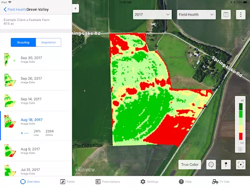 Sprawdź, co dzieje się w głębi pola dzięki spójnemu obrazowaniu o wysokiej jakości. Mapy działań rozpoznawczych pomagają wcześnie identyfikować problemy, nadawać priorytety działaniom rozpoznawczym, podejmować konkretne czynności oraz chronić uprawy. Mapy roślinności pomagają monitorować biomasę na przestrzeni czasu oraz zawierają dodatkową opcję zaawansowanego mapowania kolorowego, która pozwala uzyskać wyższy poziom szczegółowości obrazu. Kolorowe obrazy zapewniają rzeczywisty widok pól, dzięki czemu można go porównać z mapami wegetacyjnymi oraz rozpoznawczymi. Informacje na temat zdrowotności upraw można znaleźć w następujący sposób: