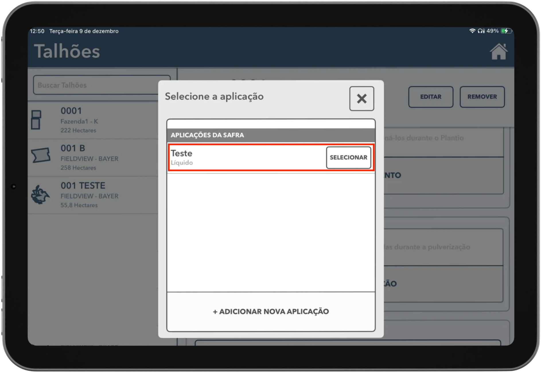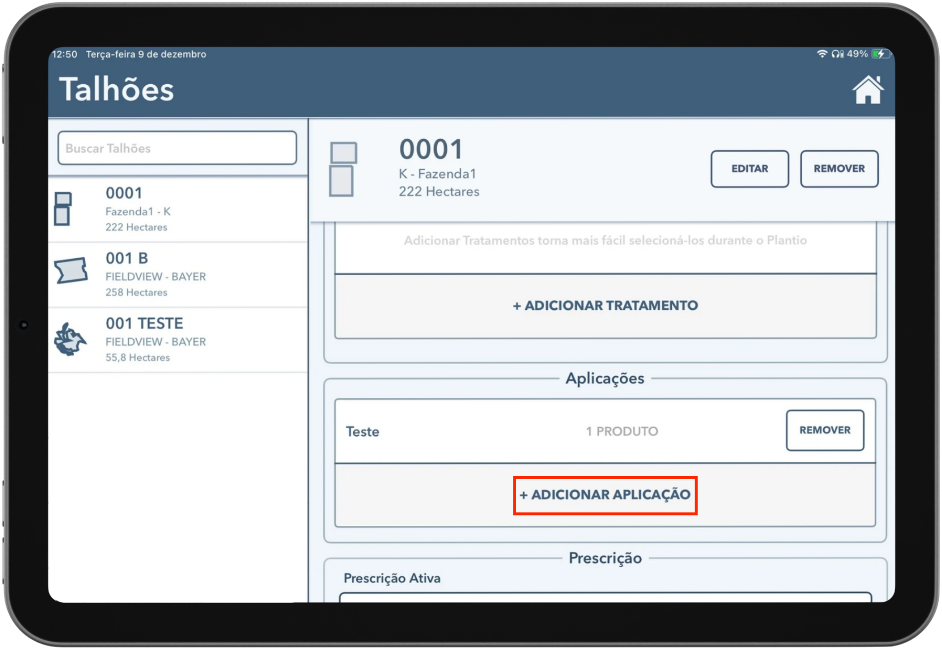 Ao abrir a página Talhões, selecione o talhão desejado e toque em + Adicionar aplicação. Em seguida, escolha a aplicação — ou mais de uma, que será realizada naquele talhão.