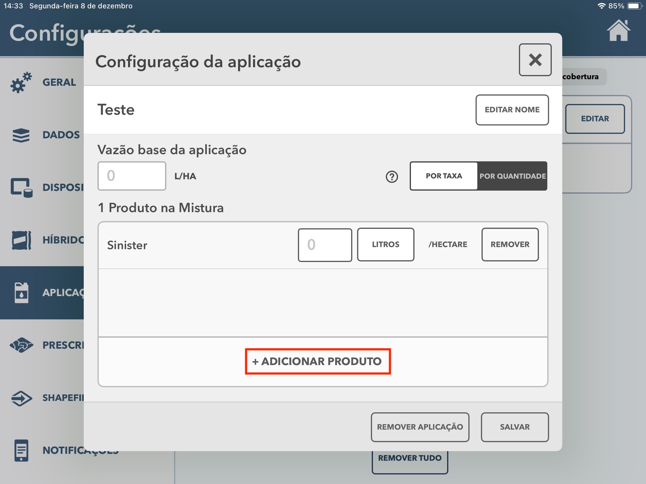 Observação: Se você editar enquanto está pulverizando, os relatórios passam a considerar a alteração apenas dali para frente (os dados já coletados não mudam).