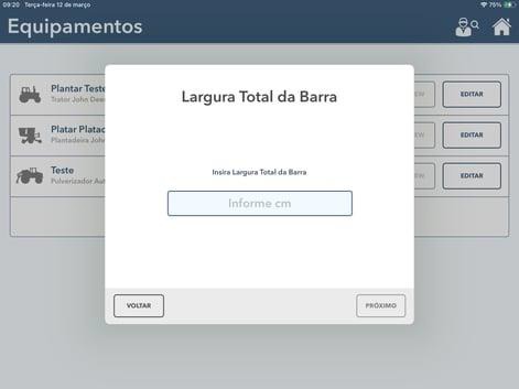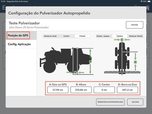 9. Na página de configuração, na aba Posição do GPS: insira as dimensões do pulverizador.