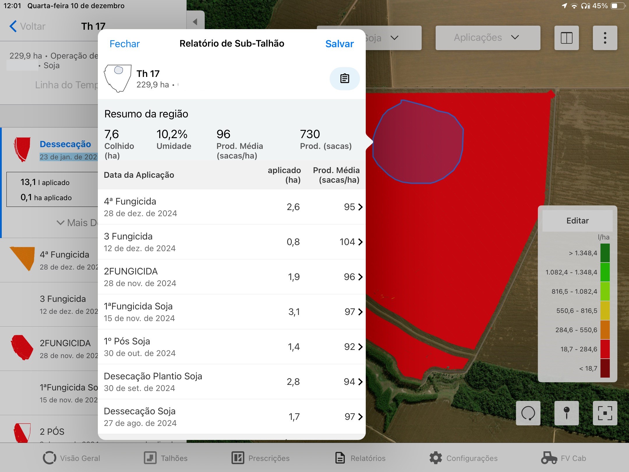 O Relatório de Região do Talhão por aplicação permite que os produtores identifiquem uma região dentro do talhão e, a partir dela, gerem um relatório que mostra os dados de produtividade para cada mistura de aplicação utilizado na região selecionada.