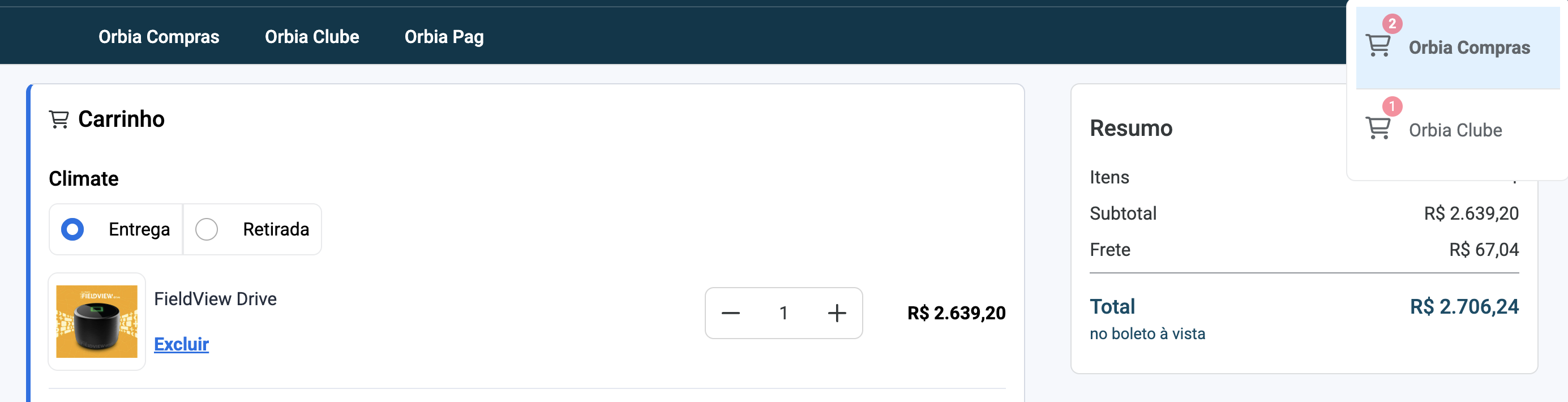 Para prosseguir com a compra, clique no ícone do carrinho localizado no canto superior direito da tela, acesse a seção Orbia Clube e confira o produto.