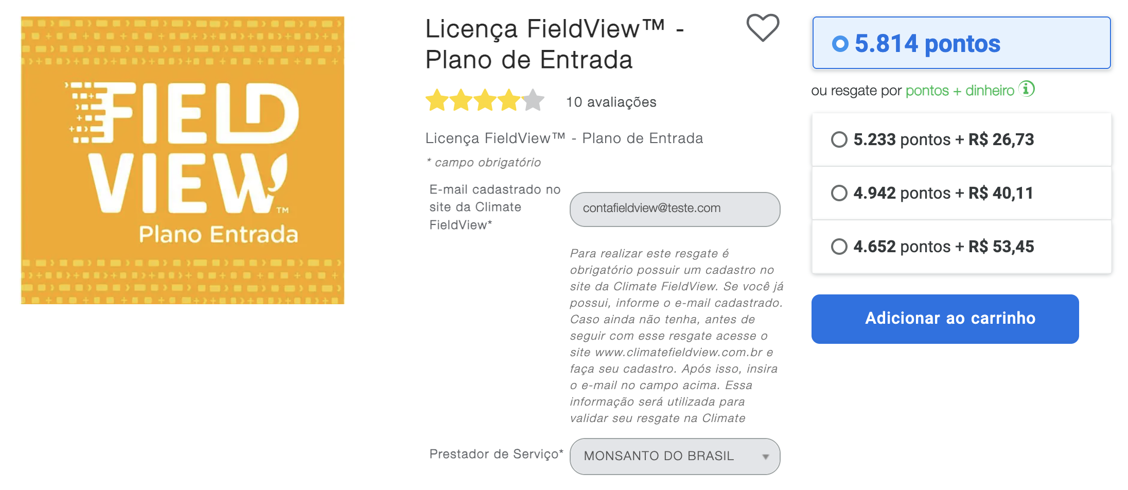 Digite o e-mail cadastrado em sua conta FieldView™, selecione pagamento em pontos e clique em Adicionar ao carrinho.