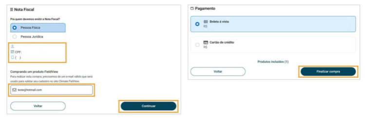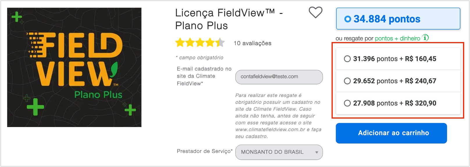 Digite o e-mail cadastrado em sua conta FieldView™, selecione pagamento em pontos +dinheiro e clique em Adicionar ao carrinho.