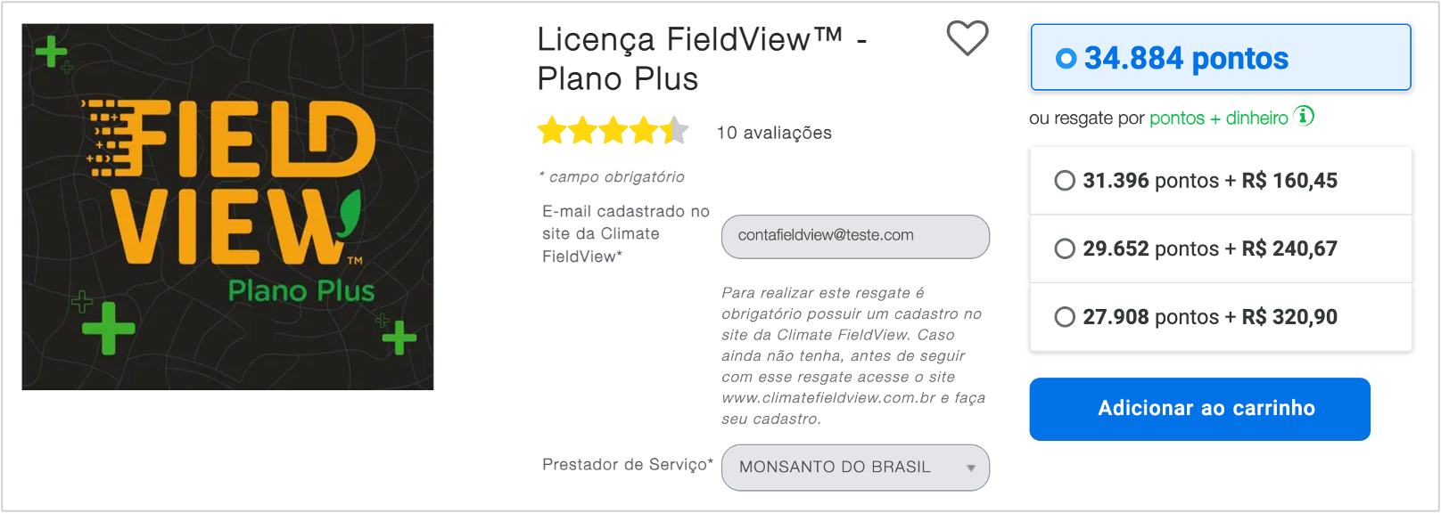Digite o e-mail cadastrado em sua conta FieldView™, selecione pagamento em pontos e clique em Adicionar ao carrinho.