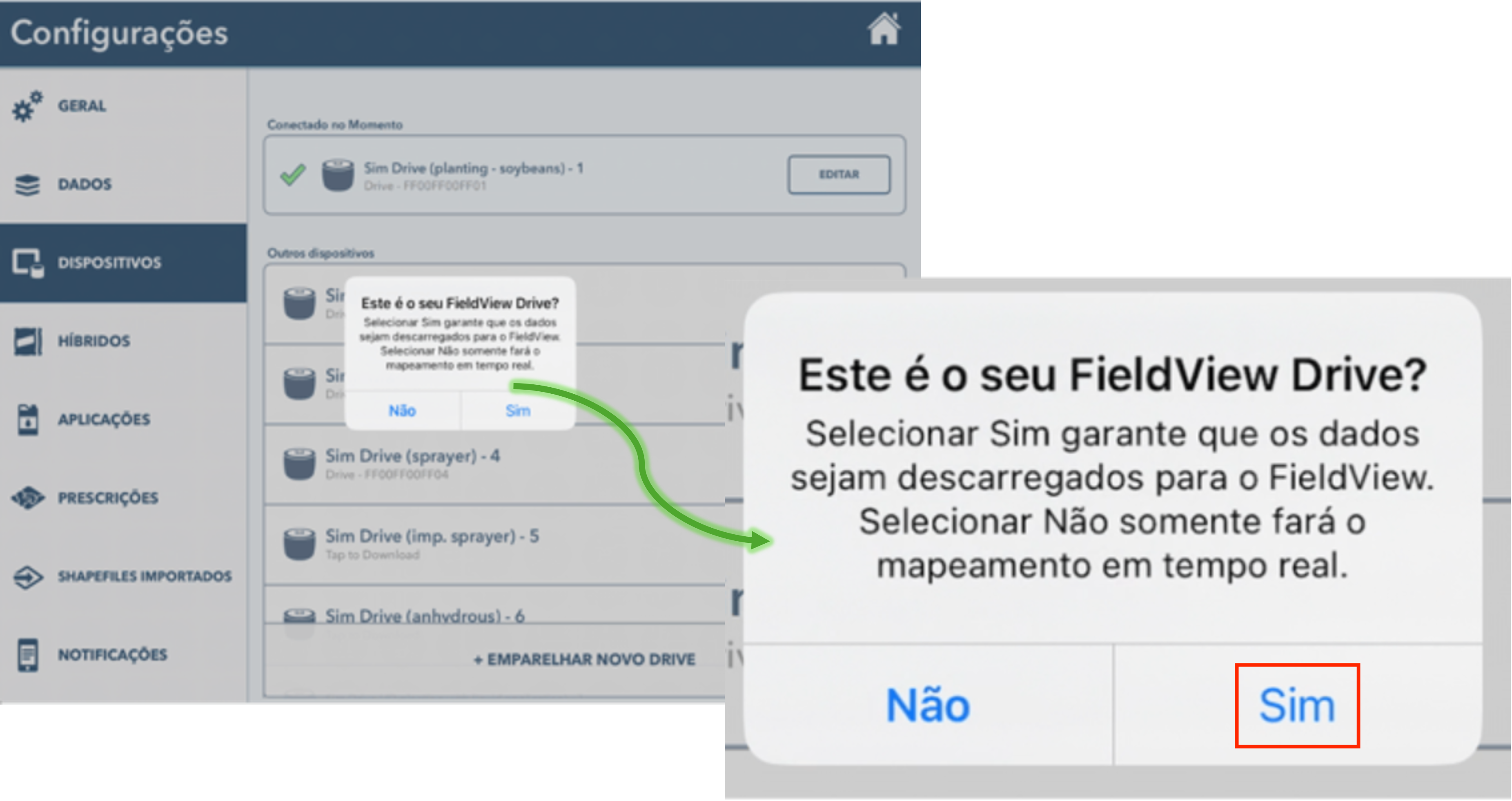 A pergunta Este é o seu FieldView Drive? é para confirmar se o dispositivo que foi detectado pelo aplicativo é realmente o FieldView™ Drive do usuário.