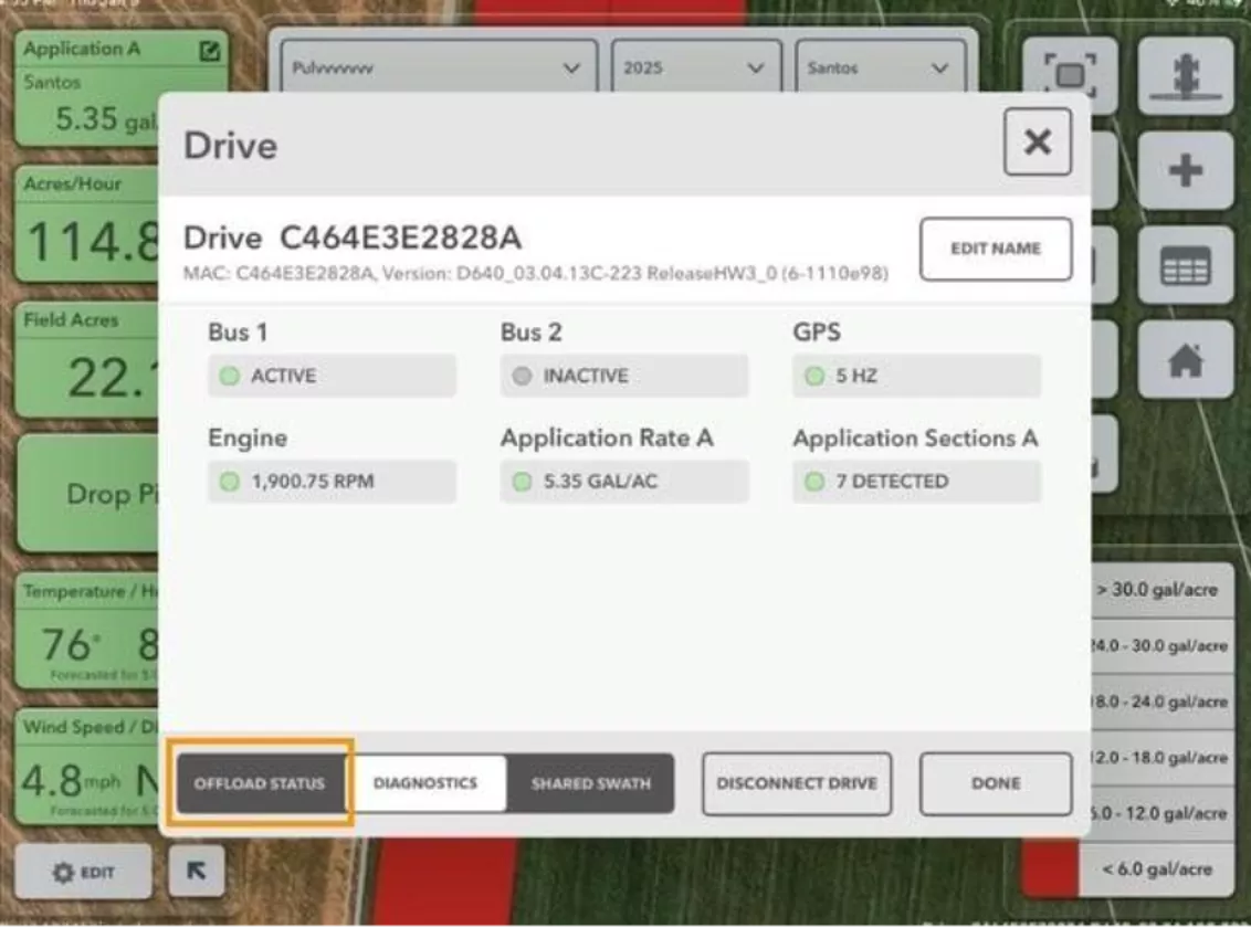 O status de transferência do FieldView™ Drive também pode ser acessado rapidamente, e em tempo real, diretamente na tela do mapeamento no aplicativo Cab.
