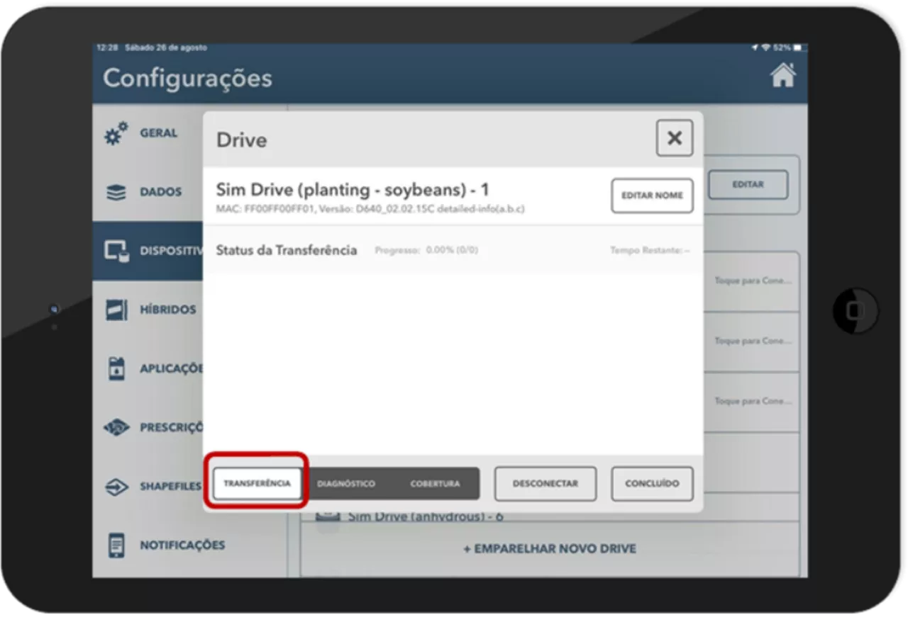 Se a porcentagem for menor que 100%, significa que ainda existem dados que precisam ser transferidos do drive para o iPad, e por isso é necessário manter o drive conectado ao Ipad até que atinja a porcentagem igual a 100%.