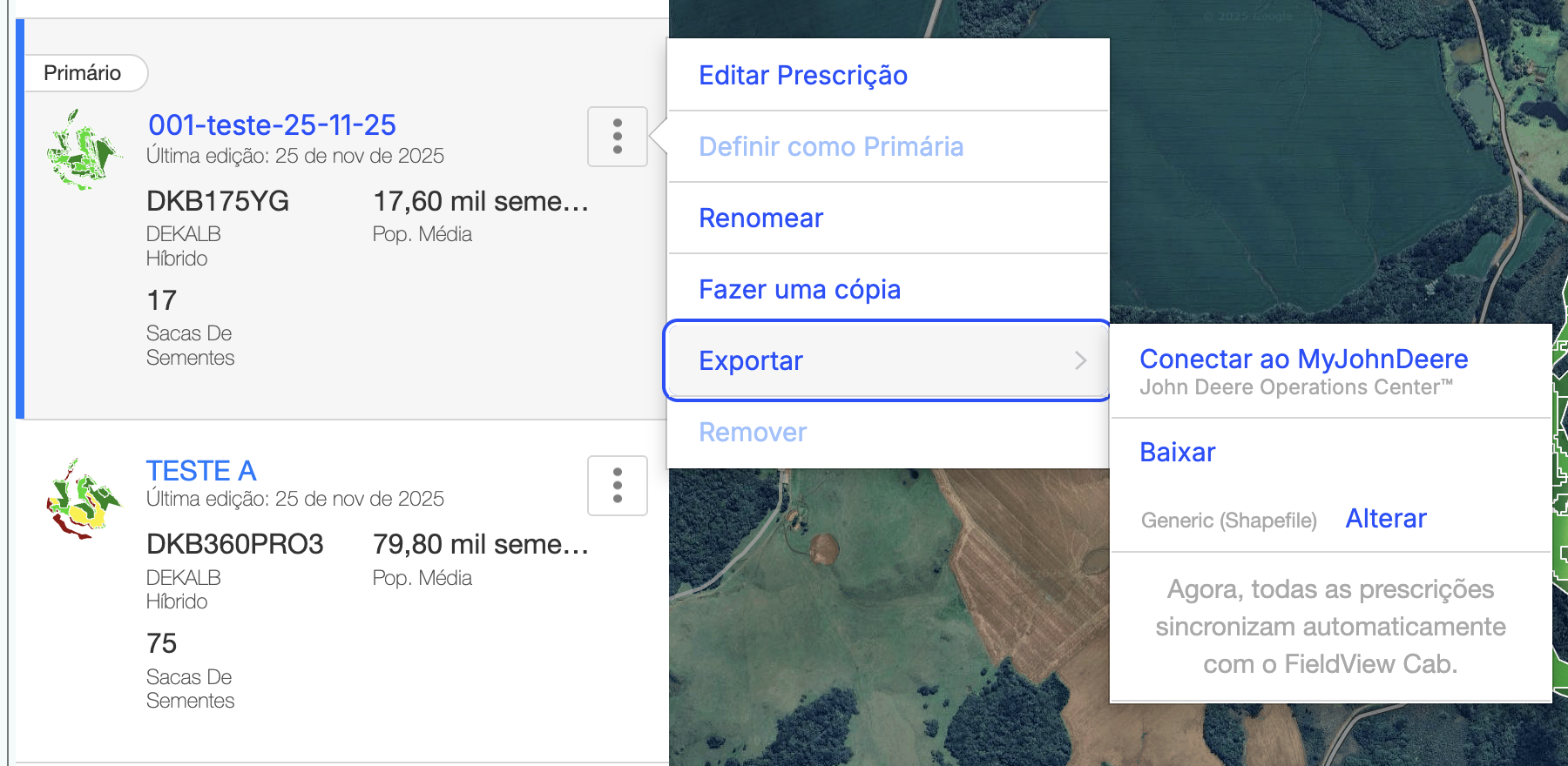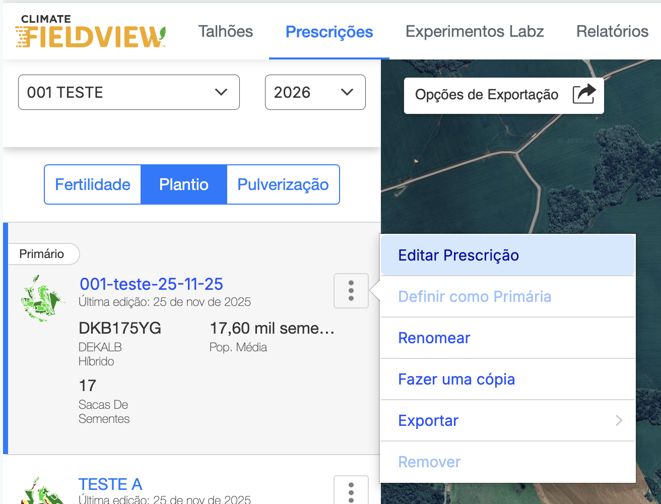 Passo 4: Escolha em qual etapa você quer adicionar a prescrição: Fertilidade, Plantio ou Pulverização. Em seguida, clique em Criar nova prescrição.