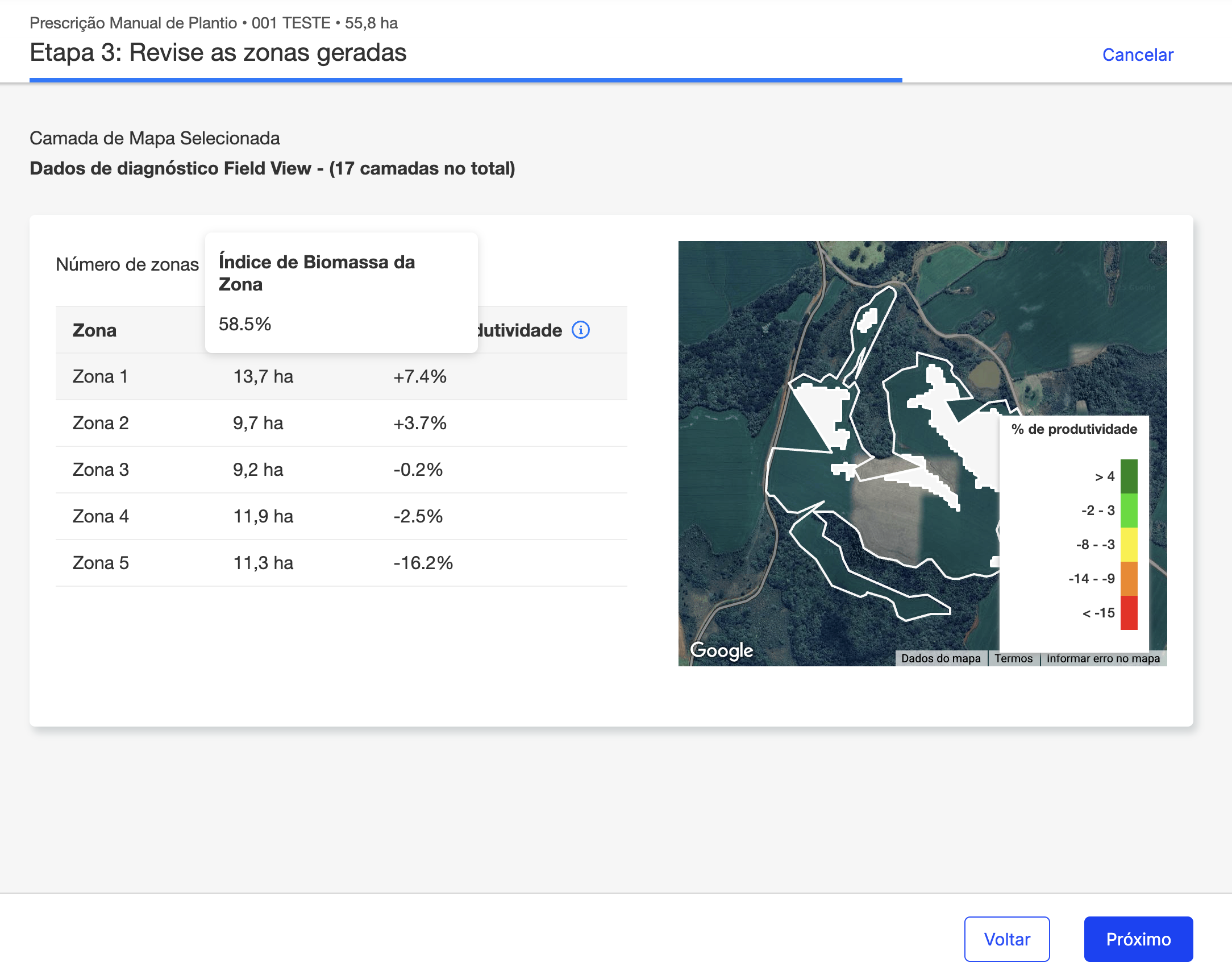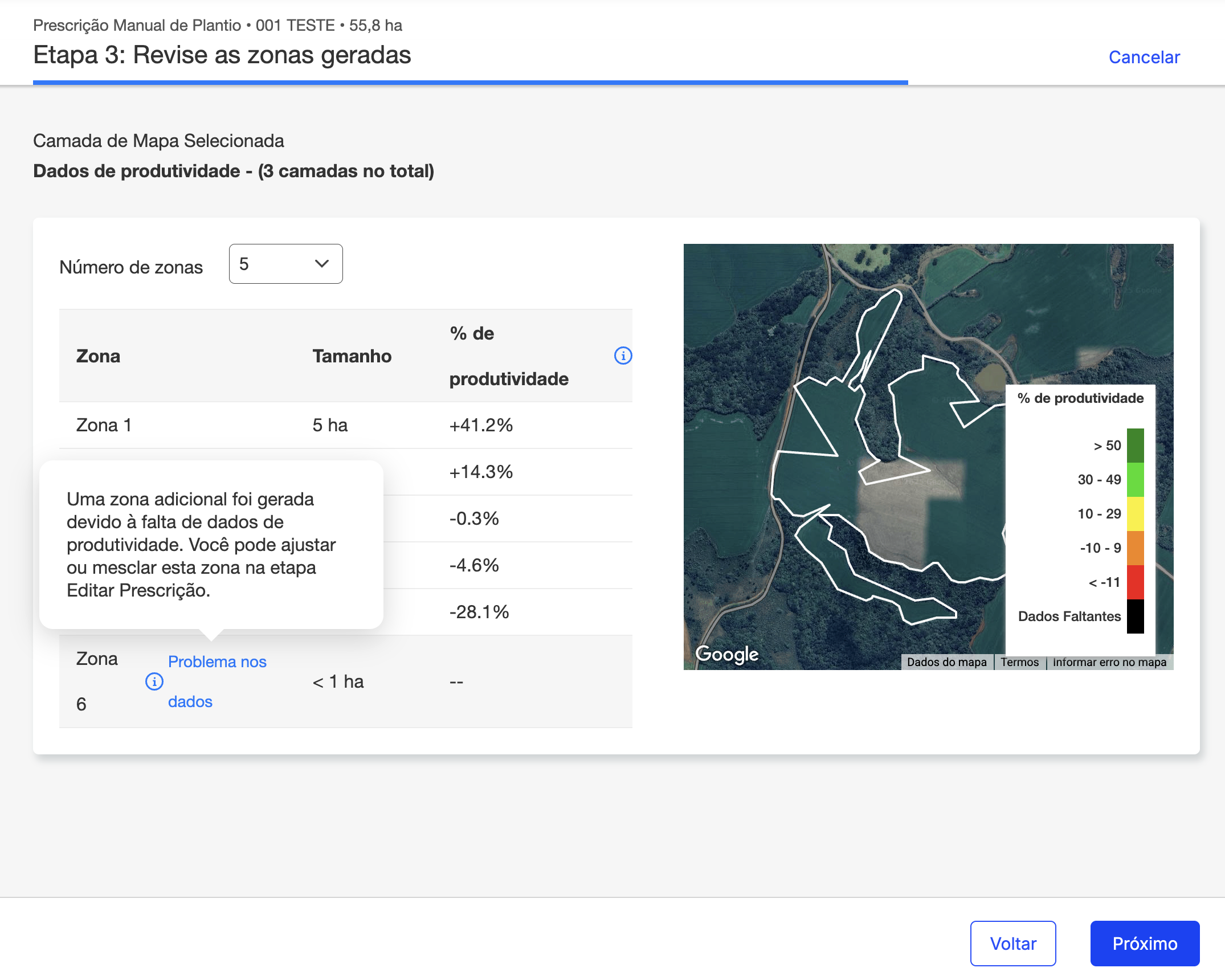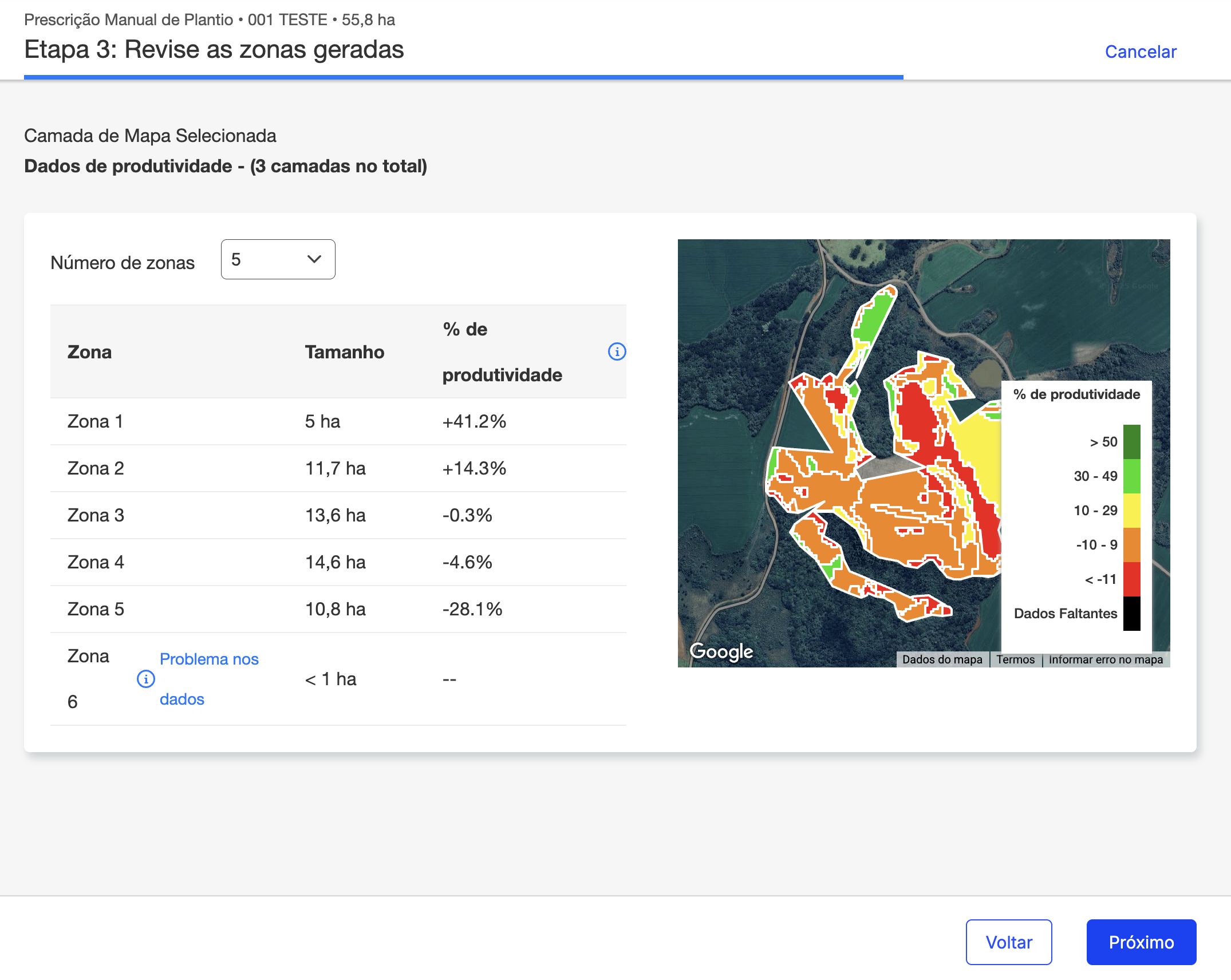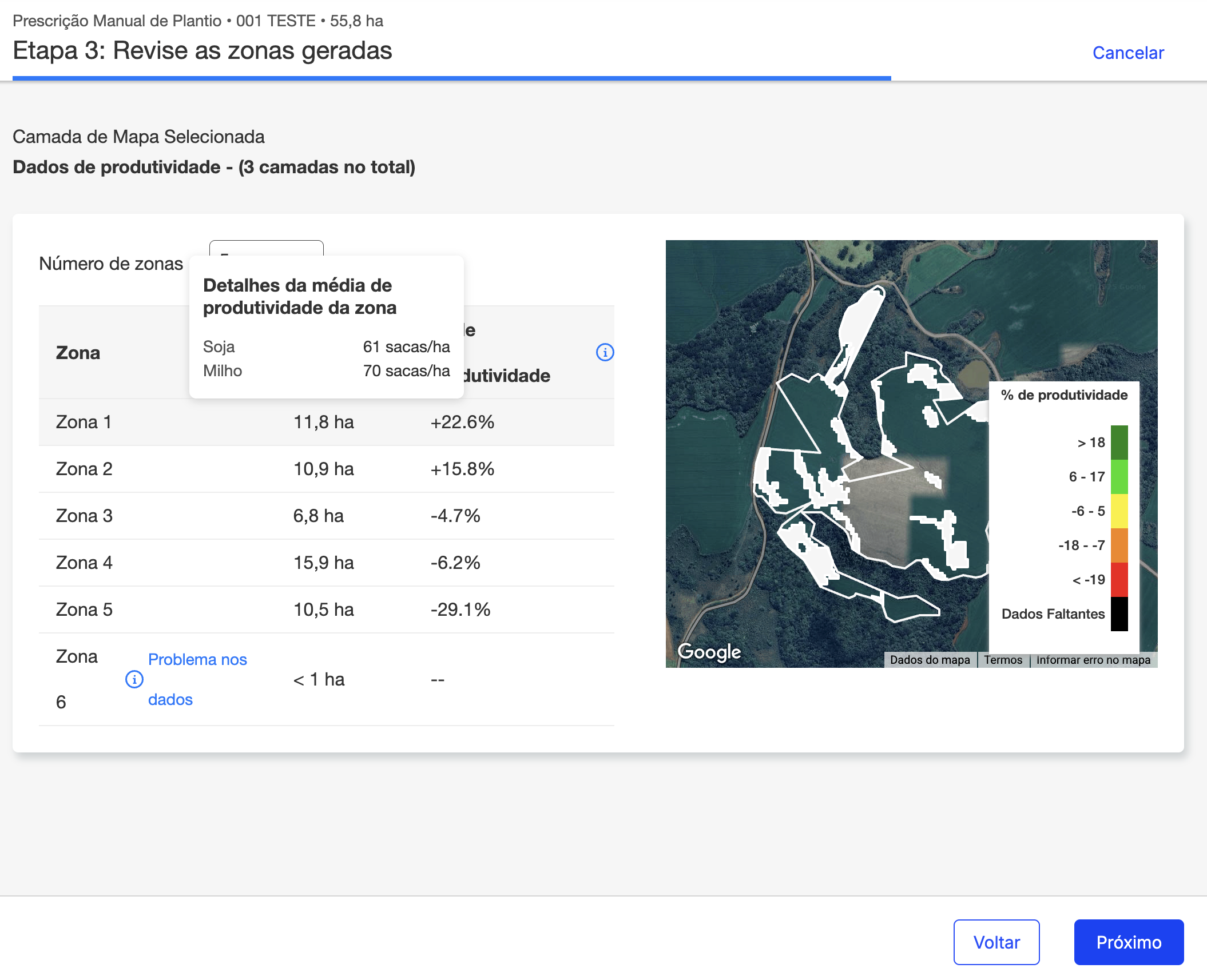 Passo 6: Agora, selecione as zonas de manejo e clique em Próximo. Dependendo do que é selecionado, você precisa preencher informações adicionais.