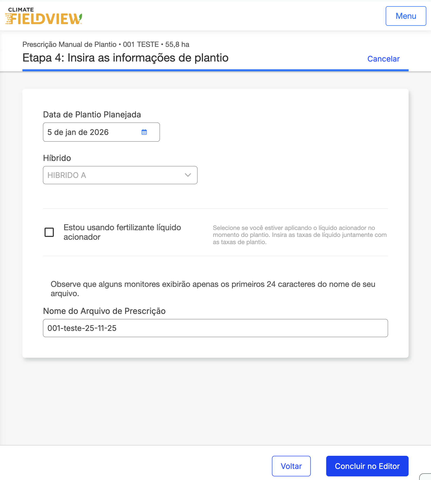 Passo 7: Em seguida, indique os detalhes do plantio, como a data e o híbrido e o nome do arquivo de prescrição.