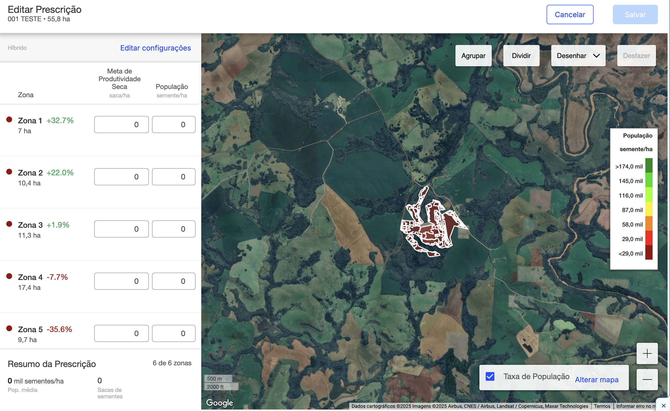 Passo 10: Ao lado esquerdo, insira a Meta de Produtividade Seca, que refere-se a meta de produtividade que você deseja alcançar naquela zona, e a População, que deve ser preenchido com a quantidade de sementes que o você deseja plantar naquela determinada zona.