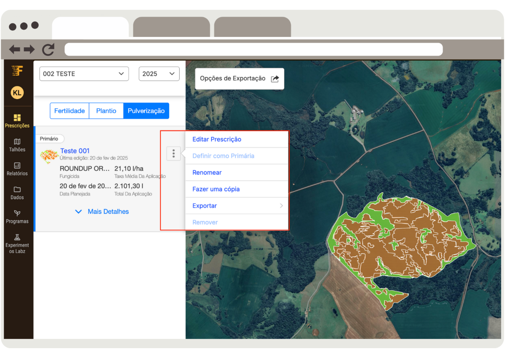 - Ver o nome da prescrição, Talhão e Safra