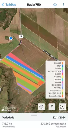 A agricultura digital também é crucial para os testes de variedades. “Com a plataforma digital, planto diferentes materiais e uma variedade padrão em uma área de testes. Depois, monitoro o desenvolvimento e realizo a colheita com o FieldView.”