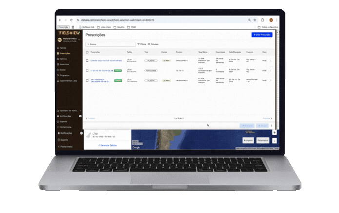Todas as prescrições organizadas em um só lugar Dentro da aba de prescrições agora os usuários poderão ver, de maneira unificada, uma lista com todas as prescrições criadas em sua conta, simplificando a gestão. Essa nova tela inclui: Colunas com informações por talhão, tipo de prescrição, cultura, tava, data planejada, fazenda, operação, última edição Possibilidade de ocultar/mostrar quais informações o cliente quer ver Filstros de busca Possibilidade de exportar/fazer o download de mais de uma prescrição ao mesmo