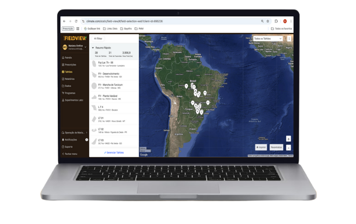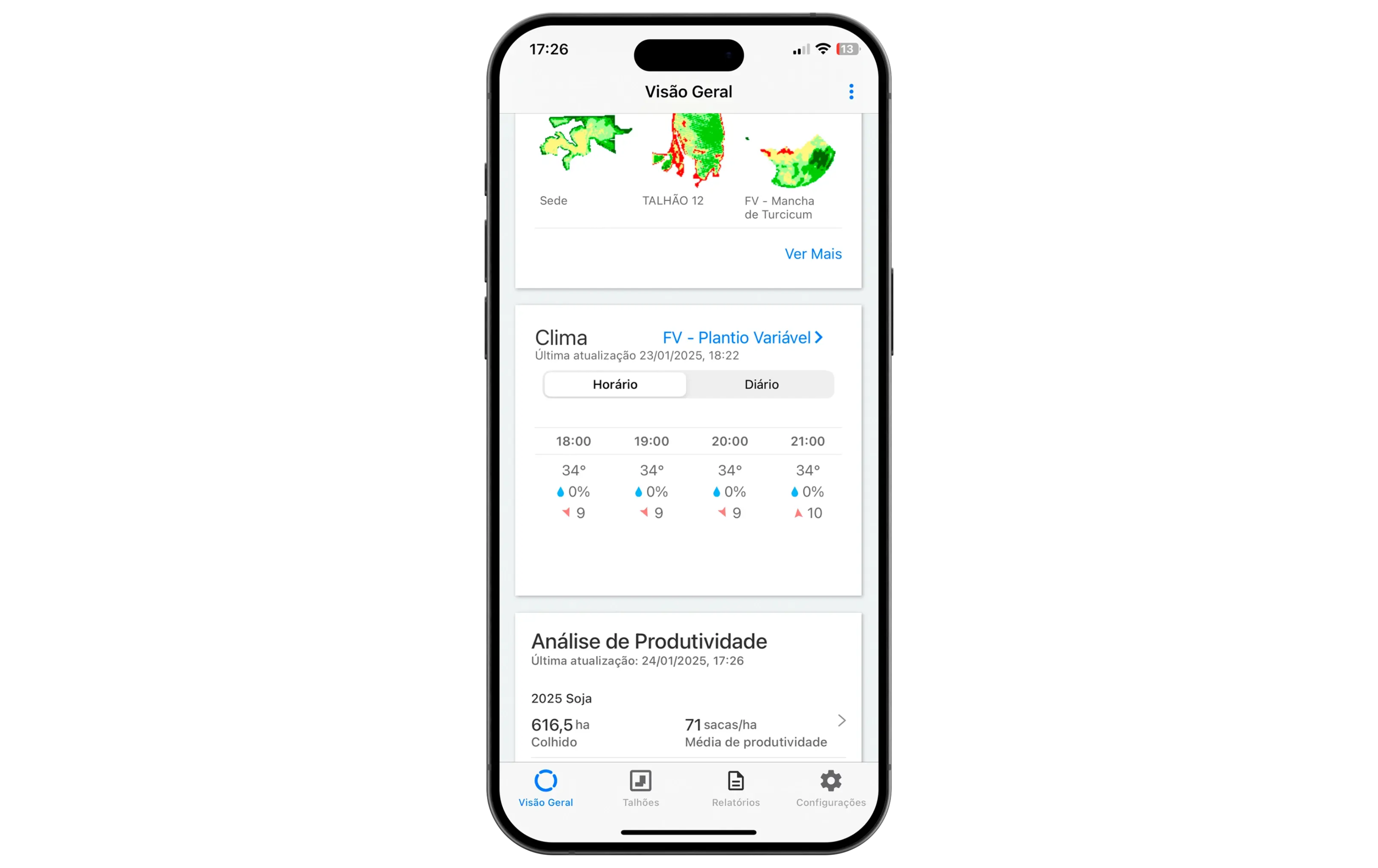 Os produtores terão acesso a dados de previsão horária e diária no nível do talhão diretamente na tela inicial do aplicativo FieldView. Ao invés vez de navegar até um talhão específico, a função permite acessar esses dados na tela inicial, facilitando a consulta para decisões operacionais, como plantio, pulverização e colheita. Disponível no App Preto, em iOS e Android. problemas. O botão é bem-vindo principalmente para os produtores que precisam trocar Drives entre diferentes máquinas.