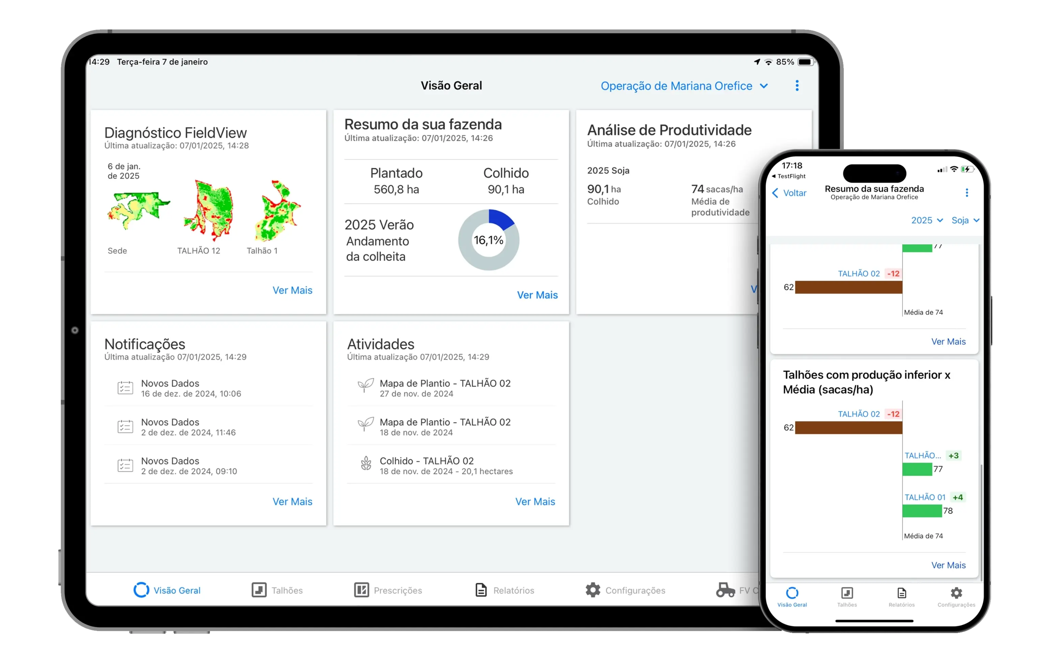 A partir de agora o FieldView conta com uma atualização que permite a multi seleção de operações no aplicativo! Selecione e tenha o panorama de quantas operações, fazendas, áreas e até mesmo arrendamentos desejar! Personalize e compare informações: Analise em uma mesma áreas o desempenho de híbridos e questões de campo para culturas selecionadas e com variáveis de clima, para tomar melhores decisões agronômicas. Realize um diagnóstico mais personalizado e preciso sobre as suas operações!