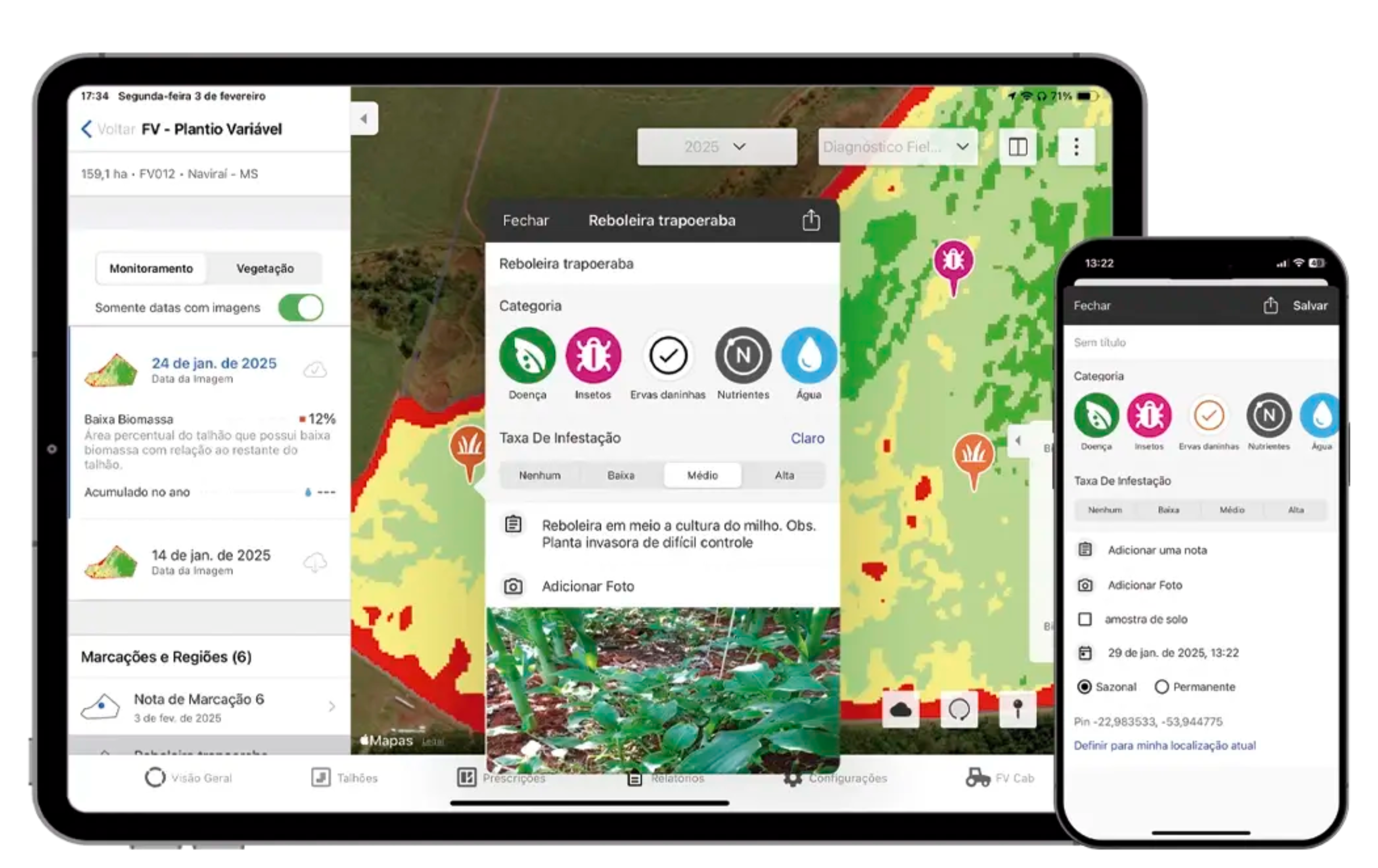 Os clientes agora terão uma experiência mais intuitiva e estruturada com a ferramenta de monitoramento, que permite inserir PINs de diferentes categorias (doenças, insetos, daninhas, problema de nutrientes etc). Também é possível registrar a amostragem de solo, marcando se a análise foi realizada no talhão. As mudanças nesta ferramenta incluem registrar notas acionáveis em cada PIN, o que possibilita obter insights mais detalhados. Já na versão web, é possível incluir fotos. A novidade está disponível no App Preto e no Climate.com, tanto em Android como iOS.