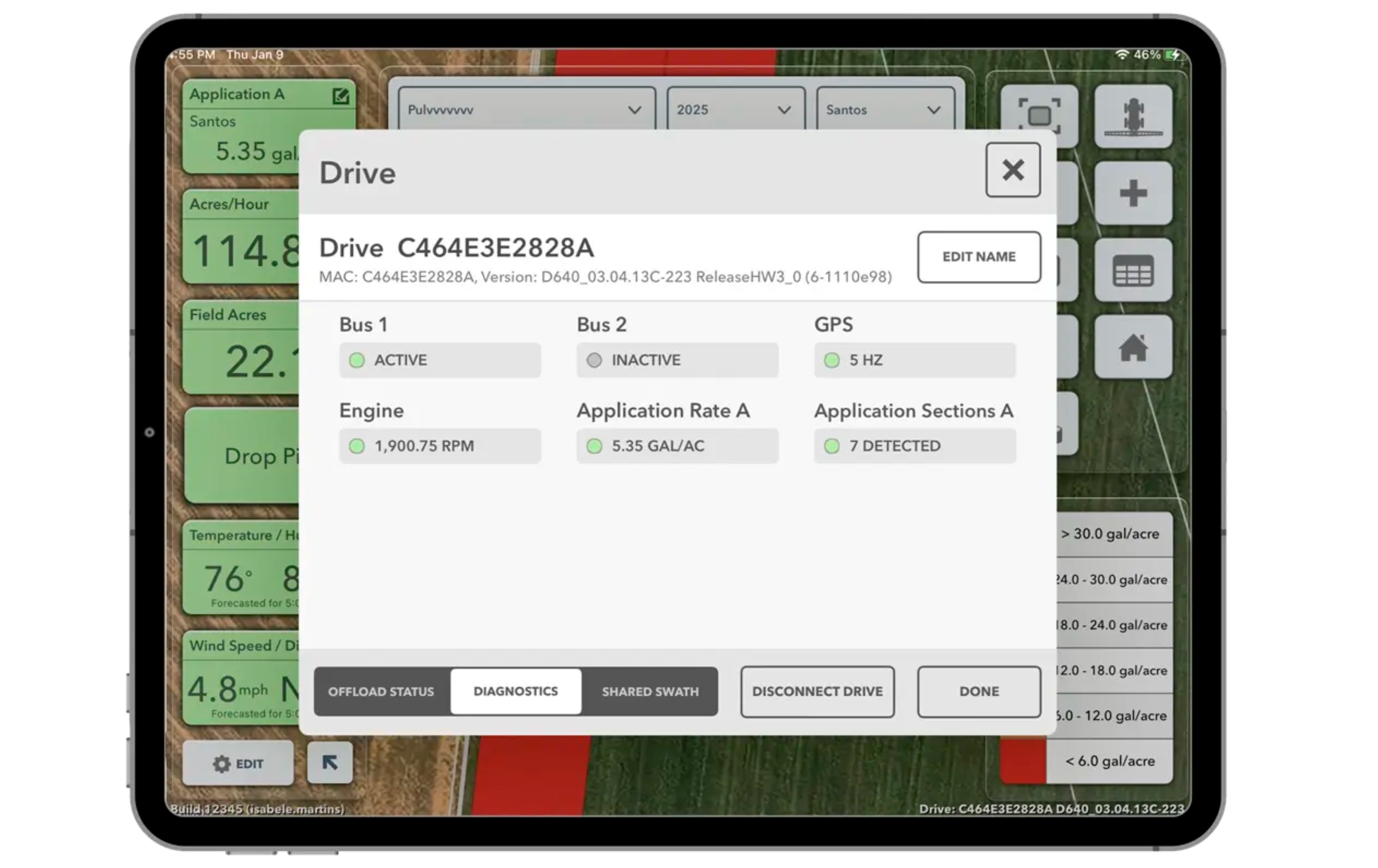 O desempenho dentro da cabine foi aprimorado, oferecendo uma experiência melhor para o operador. Agora, há maior estabilidade na conexão do Drive e melhor desempenho na transferência de dados. Além disso, o desempenho geral e a sincronização do CloudSync foram melhorados, essenciais para agricultores que coletam dados com o FieldView Cab. As melhorias incluem um RemoteView mais rápido, uma experiência de busca aprimorada ao adicionar novos híbridos à conta, e uma lógica aperfeiçoada para implementos montados em três pontos em baixas velocidades, garantindo qualidade de mapeamento superior. Também foram habilitados gatilhos do trator para Controladores de Taxa Incompatíveis, oferecendo uma opção de automação, e reduzido o limite mínimo de velocidade para esses controladores, melhorando o desempenho em velocidades mais baixas. Por fim, foram feitas correções gerais de bugs e melhorias de desempenho.
