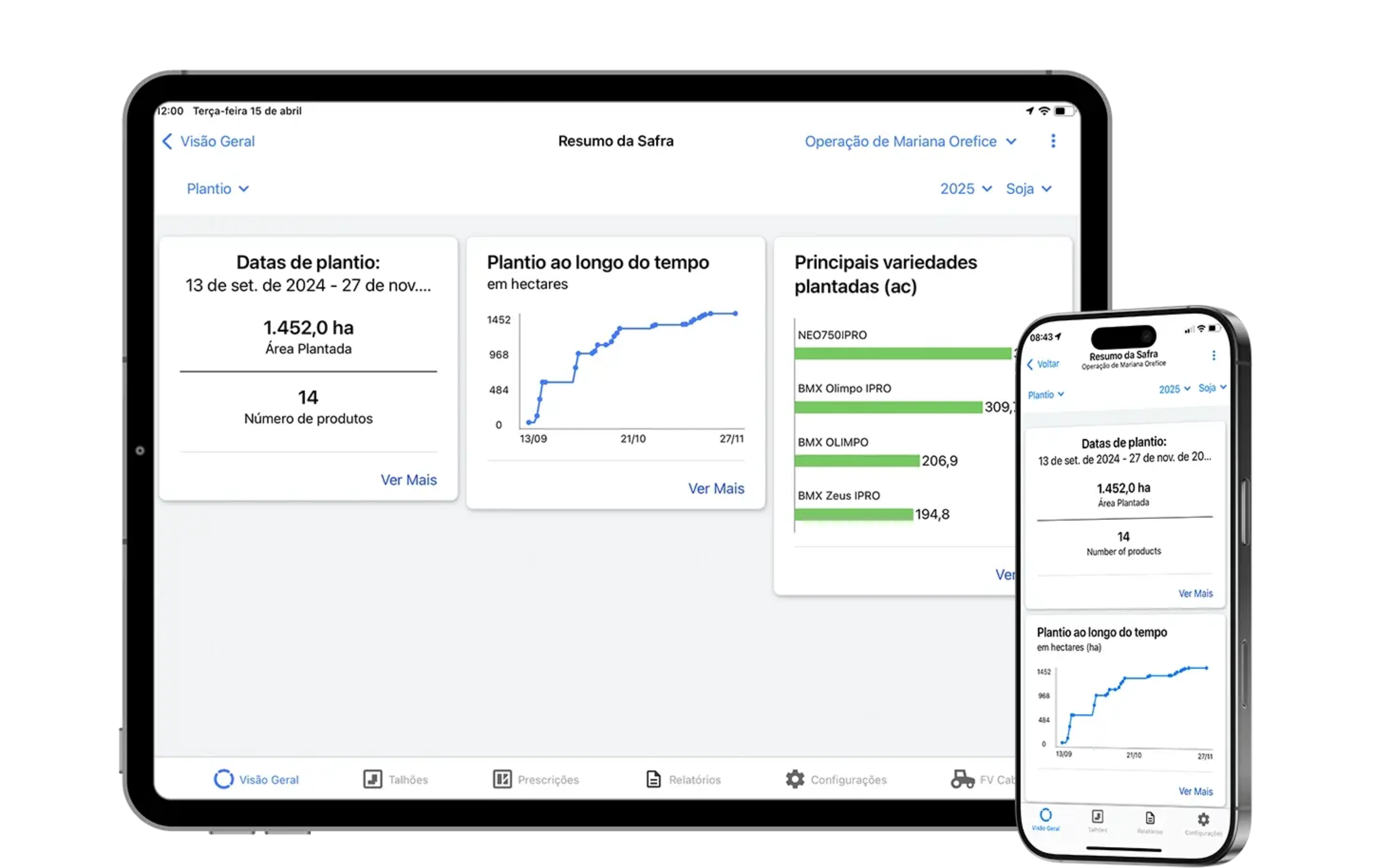 O Resumo da Safra agora inclui dados de plantio! Com poucos cliques, você pode visualizar o total de hectares plantados, a janela de plantio, o número de produtos plantados na fazenda, o plantio ao longo do tempo e as principais variedades ou híbridos plantados em hectares. Esta funcionalidade está disponível apenas no aplicativo preto para iOS. Para acessar os novos cards, é necessário ter dados de plantio.