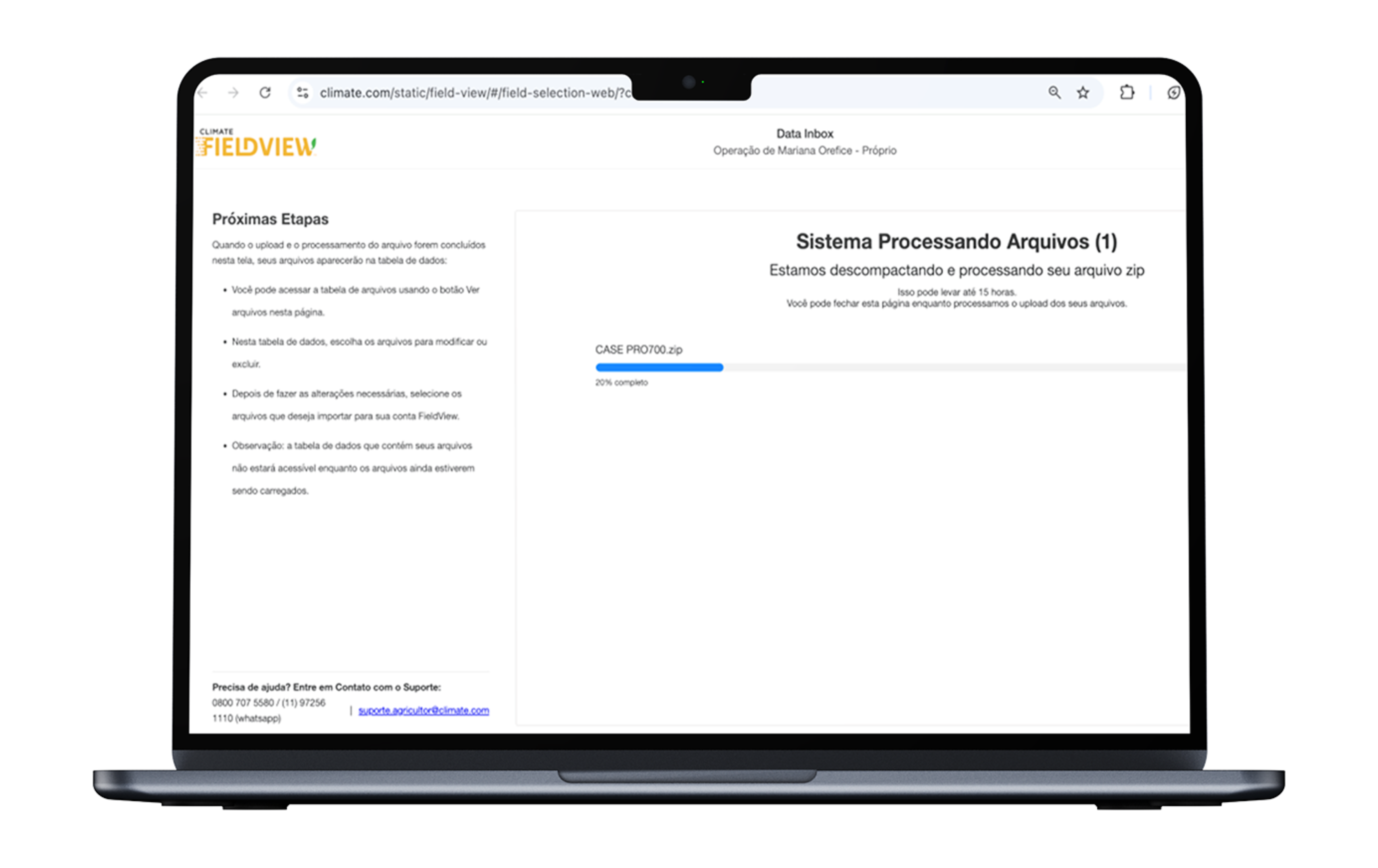 Fazer o upload de dados ficou mais fácil. Agora, você desfruta de uma experiência mais fluida e intuitiva para o upload e processamento de dados no FieldView. A nova interface do usuário facilita a gestão de dados, oferecendo instruções claras e links de suporte.