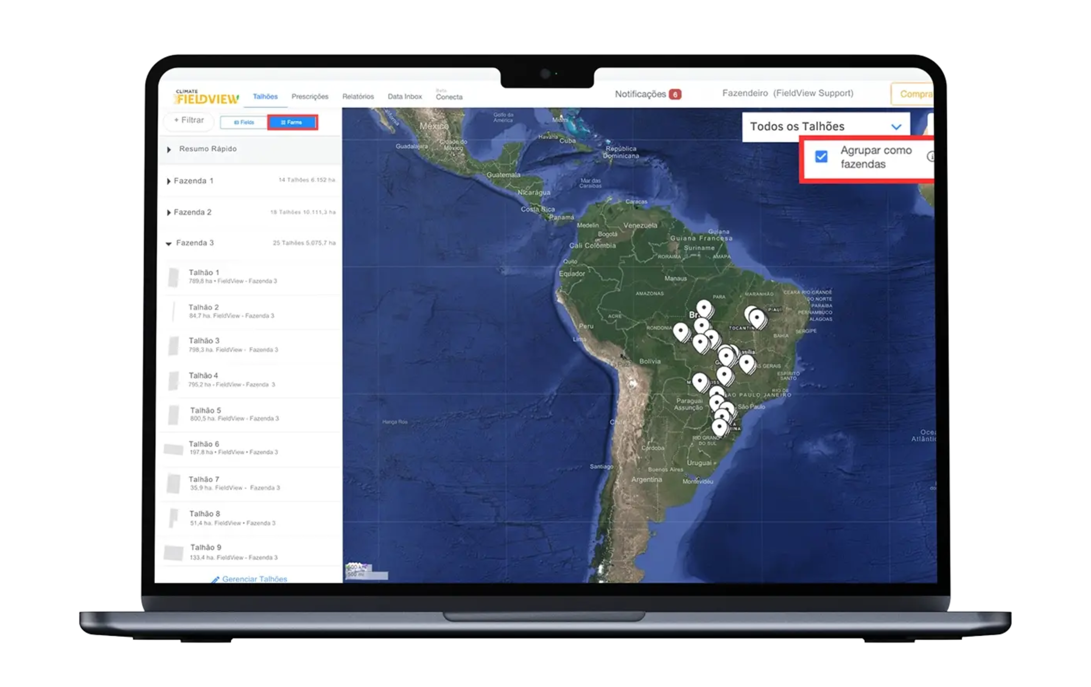 Melhora na visualização por fazenda. Essa melhoria simplifica a gestão de talhões na web para contas com mais de 500 talhões, ao agrupá-los por fazenda, tornando a navegação mais intuitiva e eficiente. Os usuários podem alternar facilmente para a visualização tradicional de talhões, se quiserem.