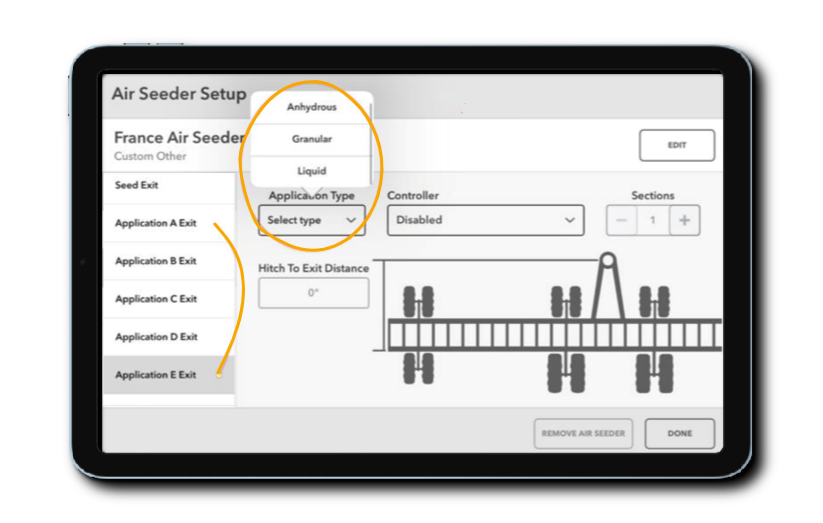Suporte do Plantium para Plantadoras e Semeadoras Pneumáticas Ao fazer a configuração da Air Seeders, com o novo campo Tipo de Aplicação, você poderá escolher entre os tipos Anidro, Liquido e Granular; Novas saídas Granulares C, D e E para Semeadoras Pneumáticas;