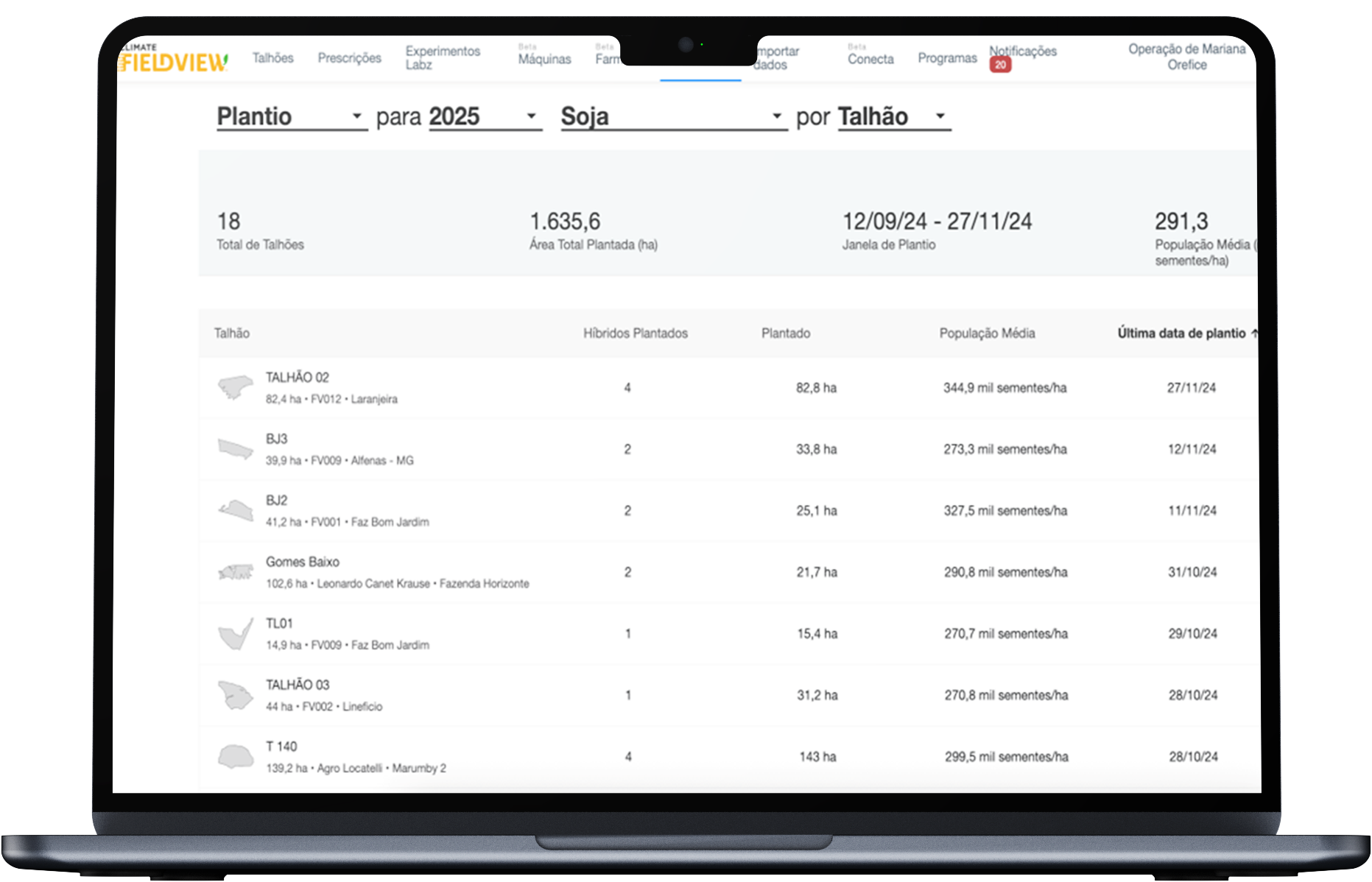 Acompanhe as informações do seu plantio também pelo site do FieldView! Esta atualização traz para a web dados essenciais da sua operação, como área total plantada, janela de plantio, população média e muito mais, oferecendo uma experiência prática e completa diretamente na tela do seu computador. Basta acessar o site fieldview.com.br, fazer login em sua conta, entrar na aba “Relatórios” e selecionar “Plantio” com os filtros desejados. Assim, você tem uma visão detalhada e organizada das informações da sua safra, de forma simples e intuitiva. Esta funcionalidade está disponível na versão web, com dados similares também acessíveis no aplicativo preto do FieldView.