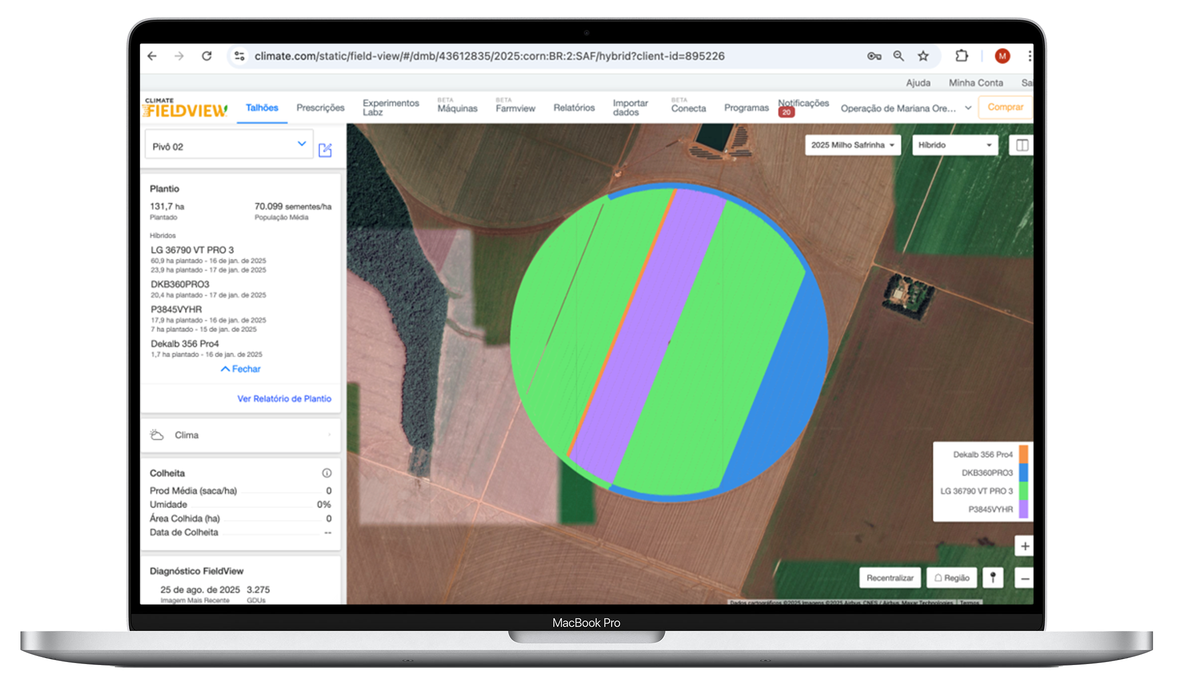 Tenha informações ainda mais completas sobre o seu plantio com a nova atualização do card de plantio na web. Agora, é possível visualizar de forma rápida e prática dados essenciais sobre o que e quanto foi plantado em cada talhão, garantindo mais agilidade na análise e evitando a necessidade de navegar por várias telas para encontrar essas informações. Para acessar, basta entrar no site fieldview.com.br, fazer login em sua conta, selecionar um talhão com dados de plantio e abrir o mapa correspondente. No card “Plantio”, você poderá conferir detalhes sobre híbrido ou variedade, área e datas de plantio, tudo reunido em um só lugar para facilitar sua tomada de decisão.